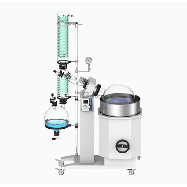 1. Висококачествена стъклена апаратура: Основните компоненти (изпарителна колба, събирателна колба, кондензатор) са изработени от 3.3 боросиликатно стъкло – отлична устойчивост на термичен шок и химична стабилност за киселини, алкали и органични разтворители.